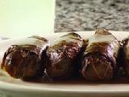 Cover the bottom of a large saucepan with a layer of grape leaves. De-stem the remaining leaves and place vein-side up on your work surface. Place about 3 ounces of meat filling on each leaf and roll them up. Once you have rolled all your grape leaves, stack them in a circular pattern in the pan. Add a little lemon juice, some olive oil and enough water to just cover the top of your last stack. Cover and let simmer for about an hour.