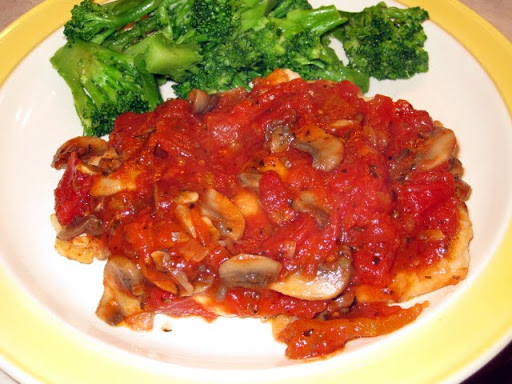 In skillet, cook chicken in oil 3 to 5 minutes each side or until done. Remove from pan; keep warm. Add mushrooms to the skillet and saute; then add thyme, broth (or wine) and stewed tomatoes; bring to a boil.