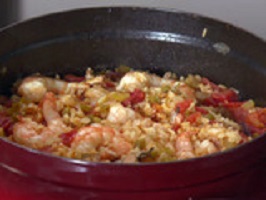 Coat a large, wide pot with olive oil and bring to medium-high heat. Add the andouille and cook for 4 to 5 minutes, or until the sausage starts to brown. Add the peppers, celery, and onion to the pan, season with salt and a pinch crushed red pepper. Cook 7 to 8 minutes or until the mixture has softened and is very aromatic. Toss in the garlic and cook for 2 to 3 more minutes. Add the tomatoes and cayenne. Stir in the rice.