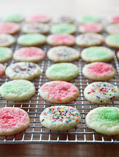 Roll rounded teaspoons of dough into balls, and arrange them on an ungreased cookie sheet, 20 cookies to a cookie sheet (they will spread considerably). With a pastry brush, moisten the top of each cookie with buttermilk, and slightly flatten the top of each cookie. Sprinkle with colored sprinkles.