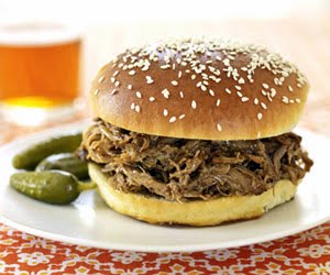 5. Using forks or your hands, pull meat into shreds, discarding excess fat, and place in bowl. Stir in sauce and put 1/2 cup meat on each bun. Serve immediately.