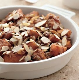 Transfer to prepare casserole dish. Top with sliced alonds or pistachios and dot with butter. Bake for 30 minutes. Makes 4 servings.