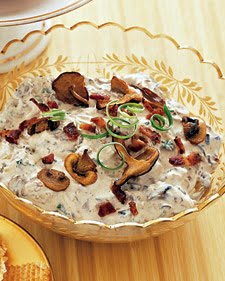 Garnish dip with scallions and remaining bacon. If desired, cook sliced mushrooms in remaining tablespoon bacon fat in a medium skillet over medium heat, stirring occasionally, until golden brown, about 2 minutes. Scatter over dip. Serve with waffle chips if desired.