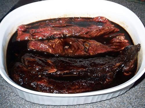 Mix everything above together. Let beef marinate in the refrigerator for at least 4 hours and chicken for at least 2 hours.