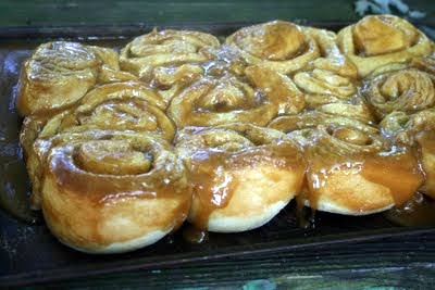 Roll out dough into a 15x6-inch rectangle. Spread with softened butter, sprinkle with brown sugar and cinnamon. Roll up into a long skinny tube; pinch shut. slice dough into rolls, 3/4-inch thick. Place dough, face down, into prepared pan with caramel sauce; let rise. Bake in oven at 350 degrees for 20 minutes or until done. Let cool 10 minutes then invert onto serving tray. I spooned whatever caramel sauce remained in the pan over the rolls. Makes 12.