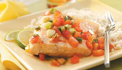 In a small bowl, combine the first four ingredients. Pour half of the marinade into a large resealable plastic bag; add the salmon. Seal bag and turn to coat. Add the tomato, pepper and onions to remaining marinade; refrigerate fish and vegetables for 30 minutes.
