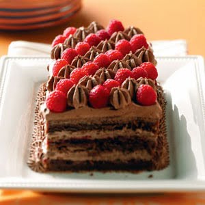 Place one cake layer on a serving platter; spread with 3/4 cup topping. Repeat layers; top with remaining cake. Frost and decorate with raspberries and remaining topping. Yield: 12 servings.