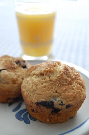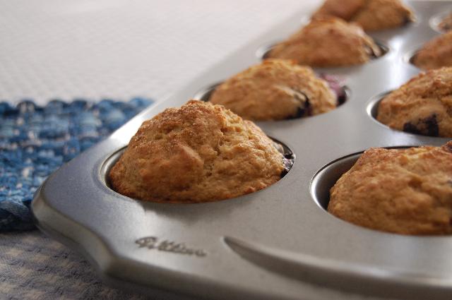 Combine milk, applesauce, and egg; set aside. Combine flour, oat bran, rolled oats, sugar, baking powder, salt and cinnamon. Stir wet ingredients into dry, just until combined. Gently fold in blueberries.
