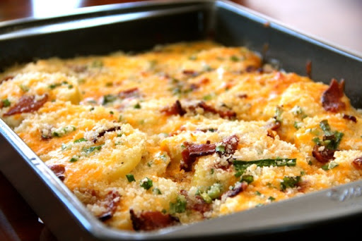 3.In a greased 9 x 13 dish, layer half of potato slices, then top with half the bacon and onions.