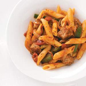 Cook pasta according to package directions Meanwhile, in a large skillet, cook the sausage, onion and green pepper in oil over medium heat until sausage is no longer pink and vegetables are tender. Add the tomatoes, tomato sauce and seasonings. Heat through. Drain pasta. Toss with tomato mixture. Sprinkle with cheese if desired.