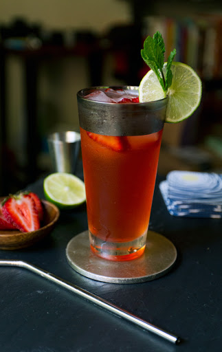 For one cocktail: Add leaves from 1 mint sprig, lime juice, and agave in a cocktail shaker and use a wooden spoon or muddler to break up the mint. Add enough ice to fill the shaker halfway, add 1 1/2 ounces of the strawberry vodka, close and shake for 15 to 20 seconds. Strain mixture into a highball glass filled halfway with ice and 1 sliced strawberry, top with ginger beer, garnish with remaining mint sprig and lime wheel and serve.