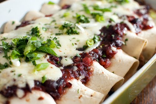 In a medium bowl, combine the remaining cranberry sauce, 1 cup of salsa, and the hot sauce. Stir to combine and Pour over the enchiladas. Cover the dish with foild, and bake 45 minutes. Remove foil, and sprinkle with remaining 3/4 cup cheese. Continue to bake, uncovered, an additional 10 minutes, or until cheese is melted and bubbly. Sprinkle with additional cilantro and scallions, and serve.