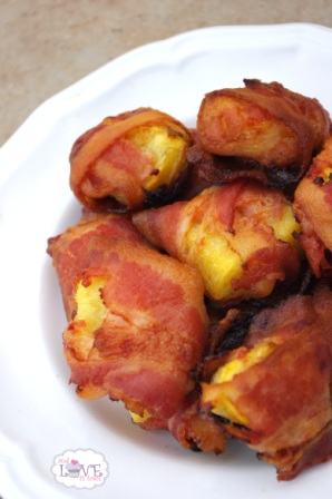 Remove pineapple bites from pan and allow to cool on paper towel lined plate, allowing the bacon to crisp and the drippings to dry.