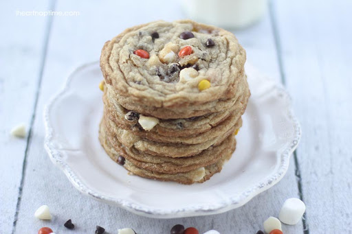 Combine butter and sugar in a large bowl. Add in vanilla and eggs; mix until combined. Mix the dry ingredients in and stir just until combined. Stir in marshmallows, chocolate chips and reeses pieces. Cover bowl and place in refrigerator for one hour.