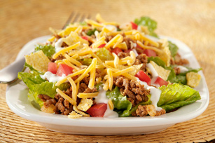 DIVIDE lettuce among 4 plates. Top evenly with meat mixture, tomatoes, cheese and crushed chips. Drizzle with dressing.
