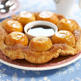 This Peach Puzzle recipe has all the pizzazz of a magic trick, as well as beautiful presentation and all-around good taste. The unusual recipe’s technique includes placing a custard cup upside down in the center of a pie plate. Peeled peaches are arranged around the cup and drizzled with a mixture of brown sugar, butter, and vanilla. Buttery biscuit dough is domed over the peaches, and then the Peach Puzzle goes into the oven. Once cooled, the pie plate is flipped over to reveal tender peaches nestled into the flaky biscuit—and a butterscotch-like sauce in the ramekin.