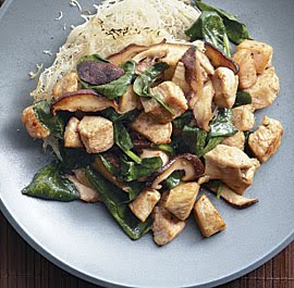 Heat 1-1/2 Tbs. of the canola oil in a 12-inch nonstick skillet over medium-high heat until shimmering hot. Add the mushrooms and cook, stirring, until softened and lightly browned, about 2 minutes. Add the chicken and cook, stirring, until it just loses its raw color, about 2 minutes. Add the spinach and cook, stirring, until it wilts, about 1 minute. Add the hoisin mixture and cook, stirring, until the chicken is cooked through, about 1 minute. Transfer to a bowl.