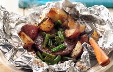•Place 1 beef patty and 1/4 cup (50 mL) of the green beans on each sheet of foil; sprinkle patties with remaining 1 1/2 teaspoons (7 mL) taco seasoning mix. Top each evenly with potatoes. Wrap each packet securely using double-fold seals, allowing room for heat expansion.