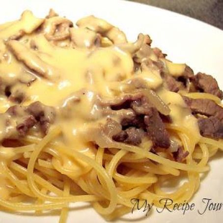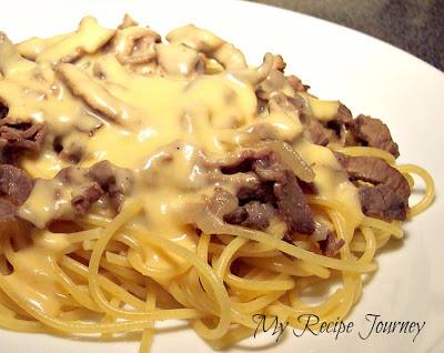 Serve cooked and drained spaghetti topped with the sautéed roast beef and onions and cheddar cheese sauce.