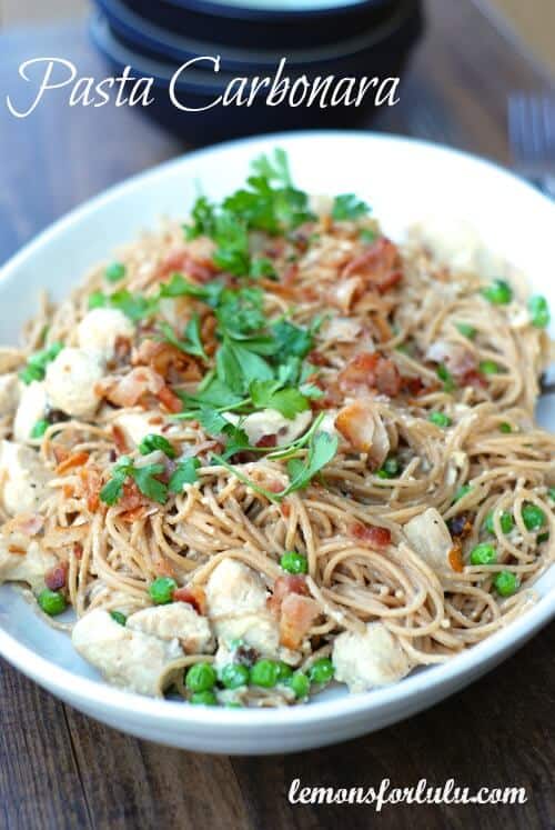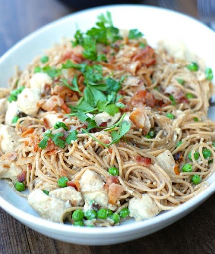 In a small bowl whisk together Eggbeaters and milk to combine. When pasta is ready drain, and return pot to stovetop. Stir in sun dried tomatoes, chicken, egg mixture and Parmesan cheese. Stir a minute or two or until mixture begins to thicken. Pour onto your serving dish. Chop reserved bacon and sprinkle over pasta along with parsley