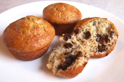 3. Fill paper-lined muffin tins 3/4 full; sprinkle tops with chocolate chips. Bake at 375 degrees for 20-25 minutes or until muffin tests done with toothpick. Allow muffins to cool 5 minutes in the pan, and then remove to wire racks to finish cooling. Store loosely covered to help prevent stickyness! :)