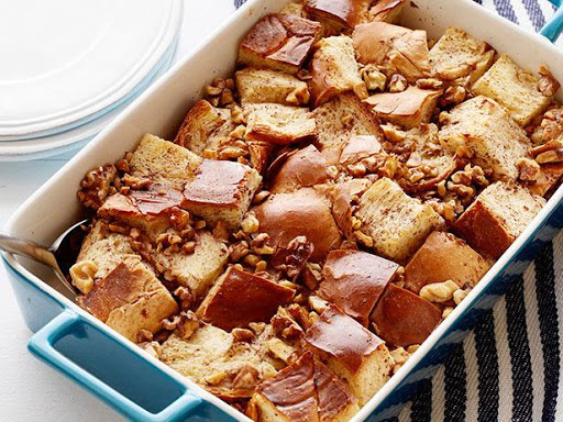 Whisk together milk, cream, eggs, 1/2 cup sugar, liqueur, vanilla, and salt in a medium bowl until egg is broken up and mixture is smooth. Evenly distribute bread and walnuts in a 2 quart baking dish, pour custard mixture over bread, and allow to soak for at least 15 minutes.