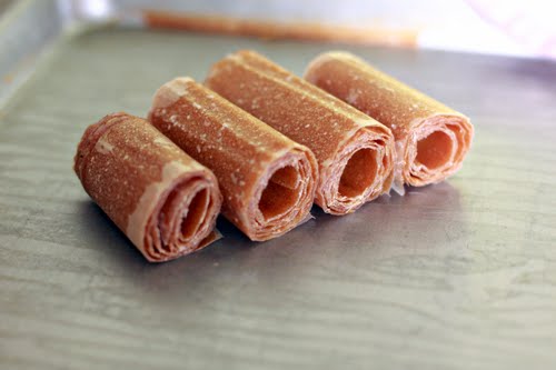 6. Remove cookie sheets from oven and allow to cool slightly. Roll up from one end to the other depending on the kinds of rolls you’d like. For Fruit-By-the-Foot-style rolls, roll from short end to short end and cut 1″ pieces off the roll. For Fruit Roll-Up-style rolls, roll the long end and cut 3-4″ rolls off the large roll.