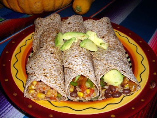 Spread about three tablespoons full of mixture lengthwise across a tortilla, and fold in sides while rolling into a burrito. Repeat with remaining tortillas.