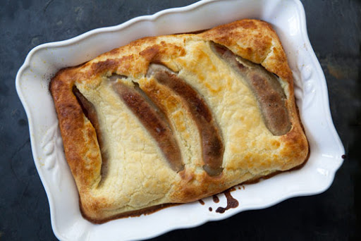 When the sausages have browned, and the dish in the oven hot, pull the oven rack out a bit, put the sausages in the casserole dish, and pour the batter over the sausages. Cook for about 20-30 minutes or until the batter is risen and golden.