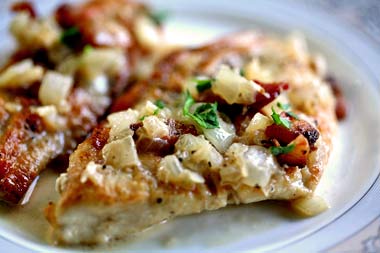 Return the chicken, onions, and pancetta to the pan and turn the cutlets over to coat. Let them reheat for 30 seconds to 1 minute. Serve with the sauce and a sprinkling of parsley.