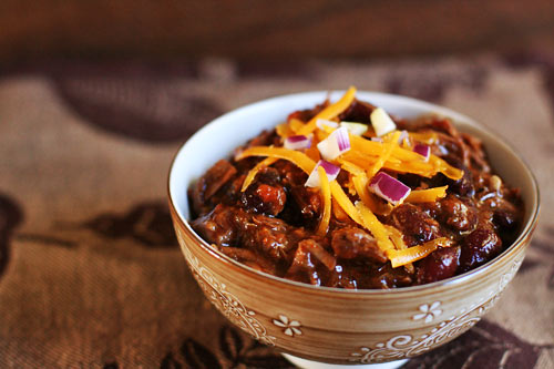 Sprinkle with grated cheddar cheese and chopped red onion. Serve with cornbread, tortilla chips, and or rice.