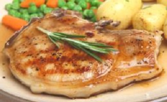 Preheat oven to 350 degrees. Sprinkle chops with salt and pepper. Heat shortening or oil in 10 inch skillet; brown chops quickly in hot shortening (do not overcook or they will be dry). Mix soup, milk and water in bowl, using wire wisk to remove lumps. Grease a 2 qt. baking dish with nonstick cooking spray or additional shortening; place browned chops in baking dish. Pour soup mixture over and around chops. Bake at 350 for 25 minutes or until chops are tender. Note: Thin chops will take less time to cook.