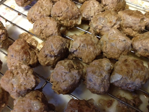 In a large skillet, melt butter and oil over medium heat. Add onions: cook stirring occasionally, until they start to caramelize, about 8 to 10 minutes. Remove onions to a large mixing bowl and add beef, egg, parsley (or Italian seasoning), salt, and red pepper flakes; mix well to combine. With damp hands, roll forty-eight 1/2-inch meatballs.