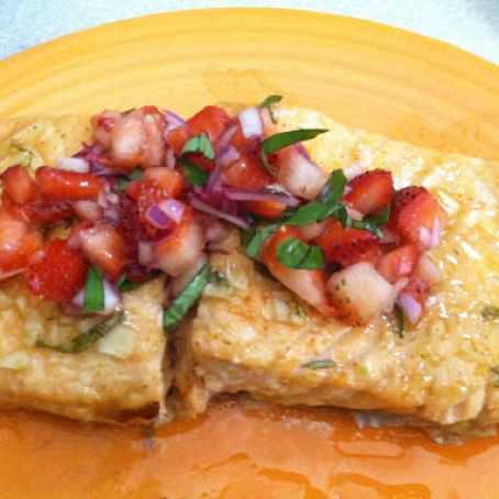 Combine the ingredients for the salsa, cover the salmon with the marinade and bake at 375F until done. Cover the salmon with the salsa and enjoy.