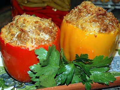 Drizzle remaining 1 Tblsp oil inside peppers, arrange cut side up in a baking dish, then stuff peppers with filling. combine ketchup, Worcestershire sauce, Tabasco sauce, and 1/4 Cup of water in a small blow., then spoon over filling. Add 1/4 Cup of water to the baking dish. Place in oven and bake for 40-50 minutes(or longer, depending on how big the peppers are that you are stuffing), until the internal temperature of the stuffed pepper is 150-160F.