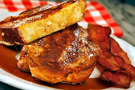 5. Slice each piece of toast in half and plate 3 half slices on each of 4 plates. Dust each with powdered sugar, if desired, and serve with warm maple syrup.