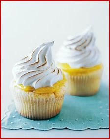 To finish, spread 1 tablespoon lemon curd onto middle of each cupcake. Fill a pastry bag fitted with a large open-star tip (Ateco #828 or Wilton #8B) with frosting. Pipe frosting onto each cupcake, swirling tip slightly and releasing as you pull up to form a peak. Hold a small kitchen torch 3 to 4 inches from surface of frosting, and wave it back and forth until frosting is lightly browned all over. Serve immediately.