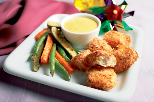 Slice the chicken breasts into two-inch long pieces. Evenly coat chicken in dressing then dredge chicken in bread crumbs and arrange on greased baking sheet and cook for 15–20 minutes or until golden.