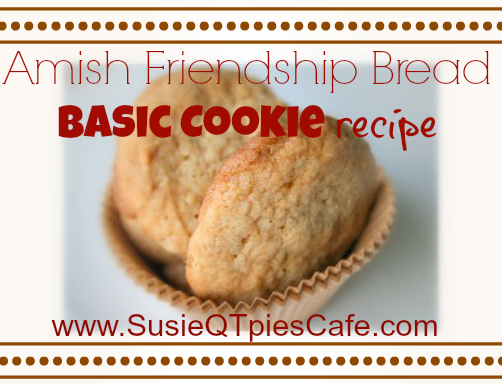 Use this recipe to create any type of Amish Friendship Bread cookie. Add up to two cups of nuts, chips and/or fruit and 1/2-1 teaspoon of your favorite spices. Use a small cookie scoop for bite size cookies or two scoops for a larger cookie. Recipe will yield up to 100 small cookies.