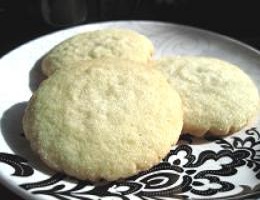 4.Roll the balls in white sugar place on parchment paper lined cookie sheets and press to flatten to about 1/4 inch thick.