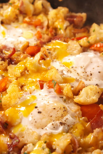 Turn heat back to medium and add onion, bell pepper, and cauliflower to the skillet. Cook, stirring occasionally, until the vegetables begin to soften and turn golden. Season with salt, pepper, and paprika.
