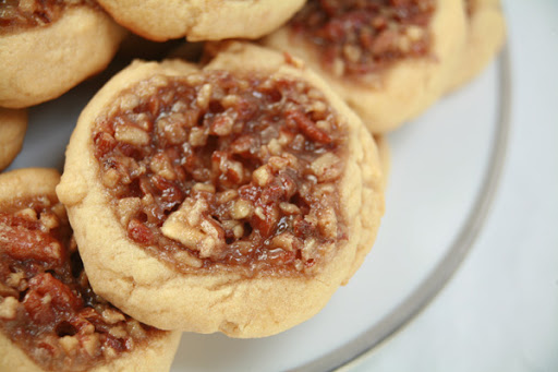 Gently use thumb to press down in the middle of each cookie, making an indentation. Roll thumb slightly to stretch the indentation out a little. Fill each indentation with about 1 tsp of pecan filling