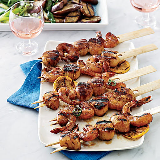 Thread the shrimp onto 8 pairs of bamboo skewers and add them to the marinade, turning to coat. Repeat with the scallops. Refrigerate the seafood for 30 minutes, turning once halfway through, then drain.