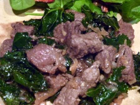 In a large pan, saute onions and garlic in olive oil for about 1 minute over medium high heat. Add meat, salt and pepper and cook until meat browns. Then add Sherry and worcestershire sauce. Reduce heat to medium, add kale and cover. Let cook for about 2 more minutes.