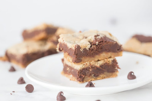 Spread ⅔ of batter into bottom of greased 9x13 pan. Spread melted chocolate mixture on top and spread to sides. Drop spoonfuls of remaining batter on top.