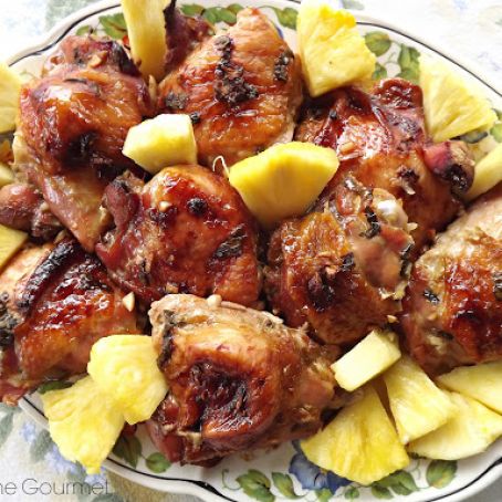 Remove the chicken from the marinade and place in a baking pan. Bake for 50 – 55 minutes or until the juices run clear and the skin is a nice golden color. Plate the chicken and serve with fresh pineapple.
