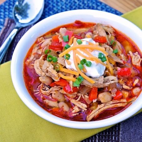 2. Add onion and bell pepper and cook, stirring occasionally, until veggies are tender, about 10 minutes. Add garlic and cook for one minute more. Add chili powder, oregano, bay leaves, diced green chiles, diced tomatoes, apple cider, chicken broth and shredded chicken. Stir to combine.
