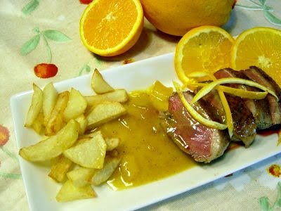 Cortar las pechugas de pato a 3 centímetros cada trozo y emplatar, poner las pieles de naranja reservadas de adorno.