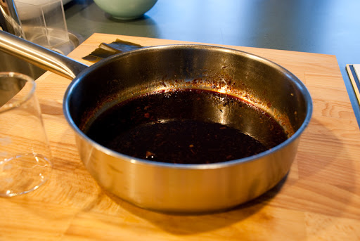 Once the fond is free from the bottom of the pan, add the remaining sake, mirin and soy to the pan and turn the heat under t o high. Bring the liquid to a boil, lower the heat so that it barely simmers. Cook for 1 hour.