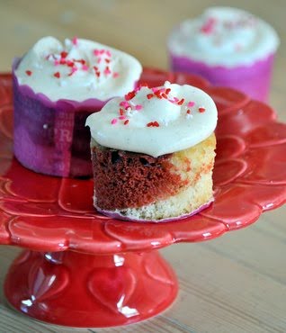 Divide white batter evenly into prepared muffin cups, then evenly divide the red batter on top of that, filling the cups about 3/4 full. Swirl each gently with a butter knife.
